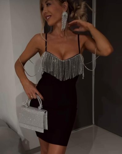 Kadın uzun kollu kruvaze yakalı taşlı mini ithal krep elbise