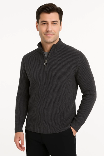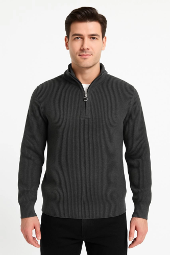 • Erkek Yarım Fermuarlı Triko Kazak Selanik Örgü Dik Yaka Pamuklu Dokuma Regular Fit Uzun Kollu Kışlık Model Füme